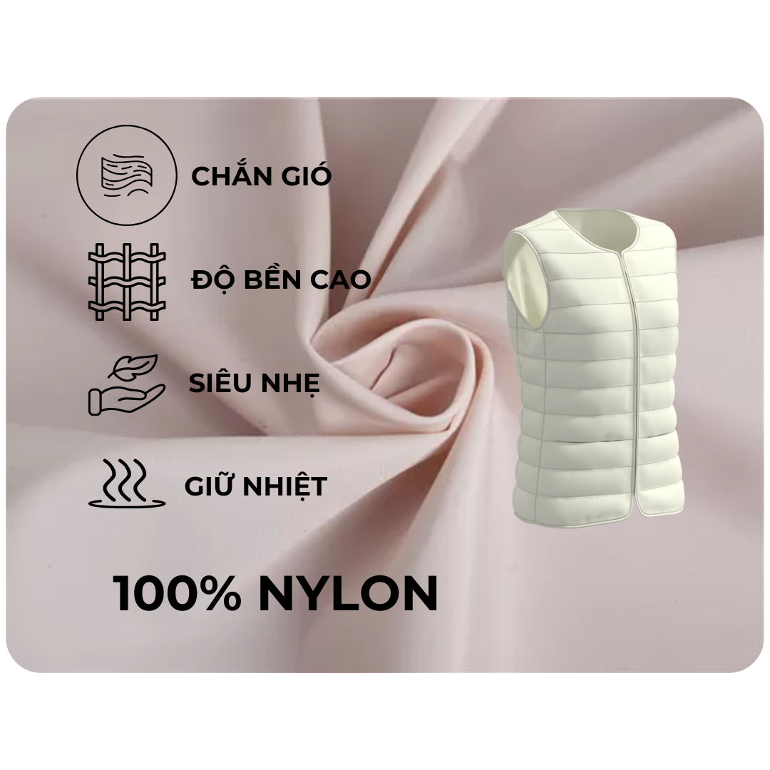 Chất liệu 100% Nylon siêu nhẹ, chắn gió tốt, giữ ấm hiệu quả và bền đẹp theo thời gian.